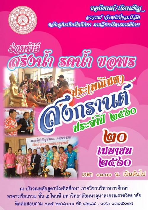 วันที่ ๒๐ เมษายน ๒๕๖๐ เวลา ๑๓.๐๐ น. หลักสูตรบัณฑิตศึกษา ภาควิชาบริหารการศึกษา ได้จัดให้มีพิธีการสรงน้ำ รดน้ำ ขอพร เนื่องในงานประเพณีมหาสงกรานต์ ประจำปี ๒๕๖๐ เพื่อสืบสานประเพณีวัฒนธรรมของไทย และเป็นศิริมงคลในการปฏิบัติหน้าที่ ในโอกาสนี้ได้นิมนต์พระสงฆ์ให้พรแก่ผู้ที่มาร่วมงาน นำโดย พระครูโสภณพุทธิศาสตร์,ผศ.ดร. คณบดีคณะครุศาสตร์ เป็นประธานให้พรกับผู้บริหาร คณาจารย์ เจ้าหน้าที่ ในหลักสูตรและผู้บริหาร คณาจารย์ จากส่วนกลางและวิทยาเขต ณ อาคารเรียนรวม ห้อง ๕๑๒ ชั้น ๕ โซนซี มหาวิทยาลัยมหาจุฬาลงกรณราชวิทยาลัย