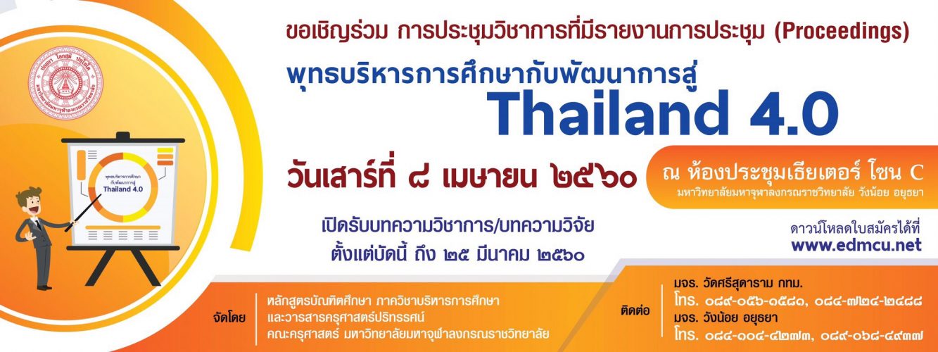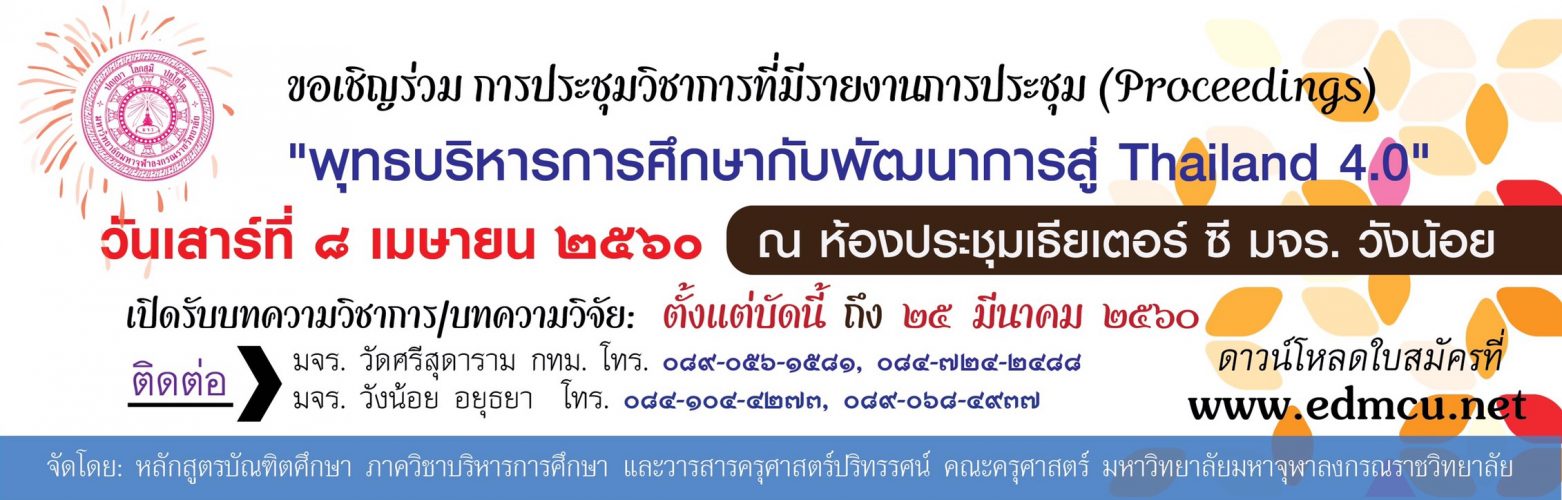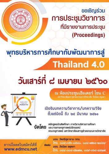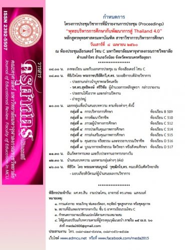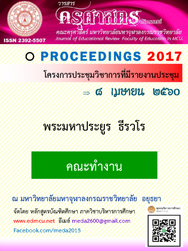 Proceedings 2017 จัดโดย หลักสูตรบัณฑิตศึกษา ภาควิชาบริหารการศึกษา และวารสารครุศาสตร์ปริทรรศน์ เมื่อวันเสาร์ที่ 8 เม.ย.2560 ณ ห้องเธียร์เตอร์ซี โดยแบ่งเป็น 7 กลุ่ม